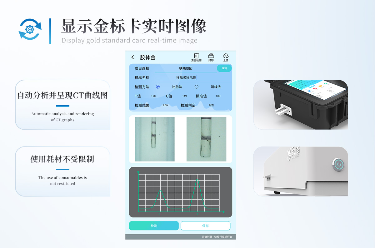 直插式自动扫描方式,可实时显示金标卡实时图像,系统自动分析并呈现出CT曲线图,CT线自动识别,无需手动调整,完成检测后自动退出检测卡。