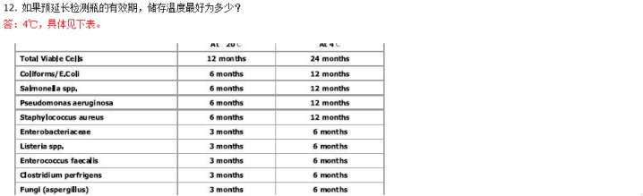 | 1. 微生物检测瓶除可以检测活菌外,死菌可以检测么? 答:不能检测死菌。 | 2. 微生物检测瓶可以检测厌氧菌么? 答:检测瓶的检测范围即包括厌氧菌(亚硫酸盐梭状芽胞杆菌 Sulphite reducing Clostridia,产气荚膜杆菌 Clostridium perfrigens),也包括需氧菌。 检测不同种微类生物的检测瓶中试剂不同。对于厌氧菌,我们有特殊的试剂,如检测产气荚膜杆菌 Clostridium perfrigens。 | 3. 检测瓶的检测原理都分别用到了哪些检测方法? 答:培养皿法、酶法、免疫法、基因法。 | 4. 对于第 3 题,你能简要叙述这些方法的优劣势么? 答:与传统的培养基法、胶体金、酶免法和 PCR 法不同,德国皇家微生物检测仪是多种方法的集合。单独使用一种检测方法都有自己的缺点:比如, PCR 法需要专业技术人员和昂贵设备; 培养基法操作复杂; 胶体金法灵敏度低; 酶免法特异性捕捉不充分。 德国皇家微生物检测瓶快速检测系列产品是以上多种方法的综合运用,吸收了每种方法的优点,弥补了各种方法的不足。 | 5. 用微生物检测瓶进行微生物检测时,步是先放样本还是无菌水? 答:都可以。 | 6. 对样本进行微生物接种时,需要在无菌环境下进行么? 答:检测瓶是通过捕捉特异性,结合多种检测法进行分析。无菌环境与否均可(临检的场所大都是非无菌环境)。 | 7. 检测瓶可以检测表面样本和固态样本么? 答:可以检测固态、液态、表面样本(用所配棉棒沾湿无菌水后涂抹表面)。纸浆等膏状、糊状、粘稠状昂本都可以检测。 | 8. 检测瓶在检测固态样本时需要对进行研磨、稀释等前处理过程么? 答:直接将样本放入检测瓶,无需任何前处理。 | 9. 每次检测的无菌水用量是多少? 答:一般是 11ml。如果是检测液态样本或水样本,建议加样 1ml,加无菌水 10ml。 | 10. 放入样本和无菌水后,“摇匀使其充分溶解和混合”这一操作步骤,无论定性分析还是定量分析,都是必要的步骤么? 答:是的,摇匀无论是定性还是定量分析都是必要步骤。 | 11. 不同的微生物对应的孵育温度是一样的么?请举例说明。 答:不一样。37 摄氏度居多:活菌总数、沙门氏菌、李斯特菌等,大肠杆菌 44 摄氏度等,详细请参考对照表。 | 12. 若是检测冷菜或者冰欺凌这样的样本,孵育是否应该低温进行? 答:对检测样本自身的温度没有限制,检测样本中微生物,请严格遵照所检测微生物对应的孵育温度,依然根据对照表。 | 13. 如果想加快检测时间,孵育温度可以调至高于所检测微生物对应的孵育温度? 答:不可以,严格遵照对照表。 | 14. 操作手册规定放入的样本量为多少? 答:0.1g‐1.0g 或 0.1ml‐1.0ml。 | 15. 若放入的样本量高于规定的样本量,检测结果会不同,或者检测结果(定量时)增加么? 答:样本量多一些或少一些,定量分析结果不会有变化。 原因:传统的微生物学检测方法,包括参考方法,即基于固体选择性培养基的菌落计数法内在的统计分散度(统计名词,也称为统计变异,是变量或概率分布蔓延,常见的例子是方差,标准差和四分位距。)大于 50%。很多实验室已经证实皇家生物检测法与其他检测方法比统计分散度低,可信度高。但不管怎样,25‐30%的统计分散度还是有的。另外,由采样产生的统计分散度同样应该考虑在 内,尤其是微生物经常容易繁殖的固态的肉制品类。 因此,加样是 0.5g 或 1.5g 所得的结果在统计上是等价的(和其他任何方法获得的结果相等)。 | 16. 对于面粉这类低密度的散装样本,可以照常检测么? 答:可以。 | 17. 对于酱油这样的深色样本,会影响定性检测结果的判读么?您有什么好的建议? 答:如果搭配检测仪进行定量分析,不存在这个问题;如果只是通过肉眼观察变色进行定性分析,深色样本如果担心肉眼不能够清晰的辨认,建议进行稀释后再进行检测。还记得第 15 题得答案么?加样是 0.5g 或 1.5g 所得的结果在统计上是等价的和其他任何方法获得的结果相等)。稀释同样的道理。 | 18. 如果是检测水样,还需要加入无菌水么?加多少? 答:建议加水样 1ml,无菌水 10ml。 | 19. 不同的微生物对应的开始颜色和呈阳性的颜色都相同么?请举例说明。 答:不同。 例如,沙门氏菌孵育 10 分钟左右出现的开始颜色为红色,阳性颜色为黄色;李斯特菌,开始颜色为蓝色,阳性颜色为黄色。具体请参考对照表。 | 20.微生物检测仪兼备孵育机的功能么? 答:是的。将检测瓶充分摇匀后立即放入检测仪,在软件上进行检测菌类设置后。 检测仪会自动进行孵育,并自动给出定量分析检测报告。 | 21. 微生物检测仪兼备振荡器的功能么? 答:不具备。需用手用力摇 2‐3 分钟,或振荡器摇 20 秒左右,直至充分溶解或混合。 | 22. 微生物检测仪的判读原理是什么? 答:微生物检测仪是一款精密的光学判读仪。通过光学原理精密探测检测瓶中的颜色变化,并给出**的定量分析检测报告。 | 23. 微生物检测仪是外接电源,还是自带充电电池? 答:外接电源。 | 24. 微生物检测仪可以同时、独立地检测多少个检测瓶? 答:8 个。同时、独立的探测,并分别给出定量分析报告。 | 25. 微生物检测仪定量分析,需要在电脑上安装分析软件么? 答:需要按照配套分析软件。 | 26. 怎样的计算机操作系统对该分析软件兼容? 答:XP, Vista, Windows 7 | 27. 如果检测仪是初次开机,接通电源后需要稍等多少时间再进行下一步操作? 答:若初次开机,开机后停留 40 秒左右继续操作为宜。 | 28. 检测仪进行定量分析时,充分混合后的检测瓶