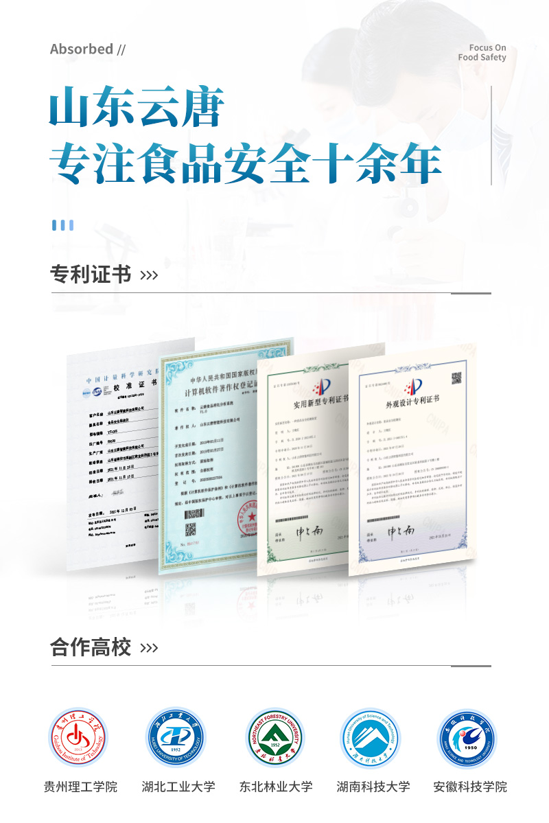 山东云唐智能科技有限公司生产的果蔬肉类检测仪,采用手提箱式一体化设计,可快速检测几十种项目,包含各种蔬菜水果中有机磷和氨基甲酸酯类农药残留,病害肉诊断:肉中组胺、挥发性盐基氮;各种肉食品中瘦肉精激素类残留、抗生素、兽药残留等现场的定性定量检测。